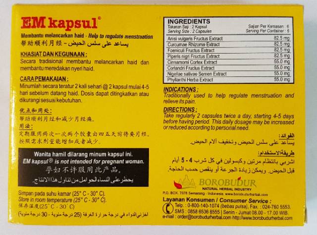 Penggunaan obat em kapsul yang paling umum adalah untuk mengatasi masalah siklus haid yang tidak teratur. Jamu dalam bentuk kapsul ini dapat mengatasi terlambat bulan memperlancar haid mengobati nyeri di bagian perut mengatasi pegal mengatasi bau badan tidak sedap selama haid dan mencegah keputihan. Di samping itu EM kapsul juga memiliki kandungan.